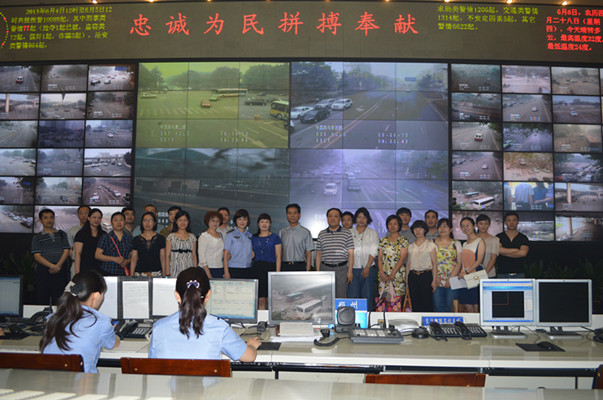 接著大家來(lái)到鐫刻有“忠誠(chéng)為民、拼搏奉獻(xiàn)”字樣的全市交通路況顯示屏前。大屏幕上顯示著鄭州市各個(gè)主要單位、部位和重要道路交叉路口的即時(shí)信息,具有GPS定位功能的警車在不停地移動(dòng),視頻畫(huà)面依序切換,“原來(lái)每時(shí)每刻都有幾百輛警車在街面巡邏,每個(gè)路口都有監(jiān)控??礃幼?,鄭州市的安保工作還是有保障的,以后更要規(guī)范自己的言行,遵守交通規(guī)則”大家很是感慨。