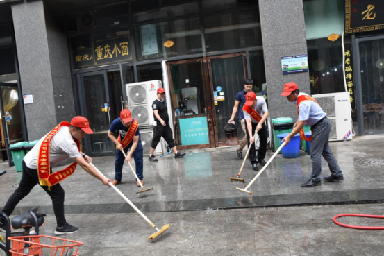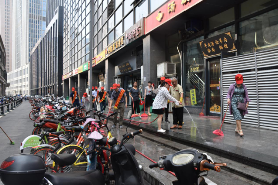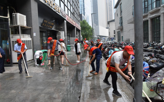 二、“全城清潔”行動。清潔家園,黨員志愿者義不容辭。日前,市建投聯(lián)合商務社區(qū)積極響應“全城清潔”行動號召,定期組織志愿者對社區(qū)單位公共區(qū)域、沿街商戶門店等內(nèi)外環(huán)境進行集中整治。7月14日下午,市建投黨員志愿者分赴中國人保大廈對沿街商戶門店和街道進行集中清理。大清掃活動采取包干打掃、分頭行動的方式,集中對沿街商鋪門店垃圾桶(池)、地面污漬等進行清洗,全面清理整治各類衛(wèi)生死角,清理積存垃圾,杜絕垃圾亂堆亂放。烈日炎炎,市建投黨員志愿者們絲毫不懼37度的高溫,頭戴小紅帽,戴著紅袖標,以高度的敬業(yè)態(tài)度和為人民服務的無比熱情,全身心投入到環(huán)境衛(wèi)生清理中,通過2個小時的辛苦勞動,使人保大廈沿街門店商鋪和街道面貌煥然一新。
