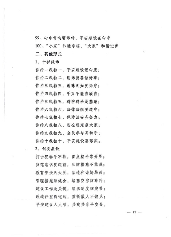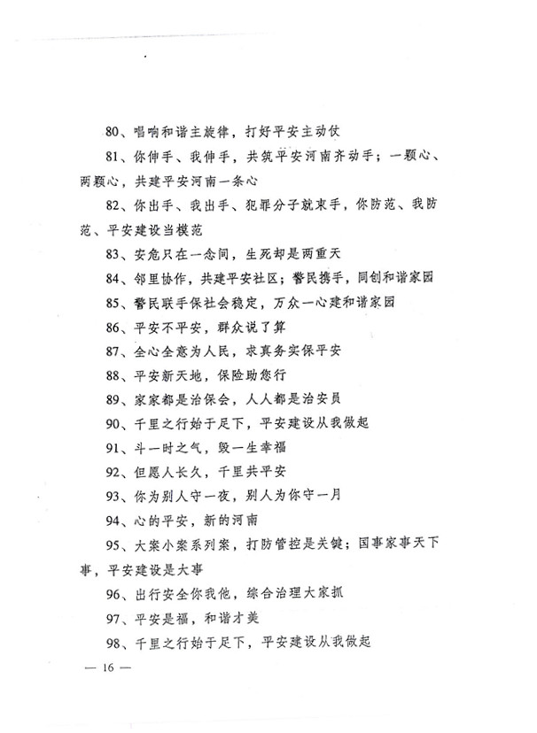 平安兩字重千斤,社會(huì)穩(wěn)定得民心。 創(chuàng)建平安人人有責(zé),構(gòu)建和諧人人參與。